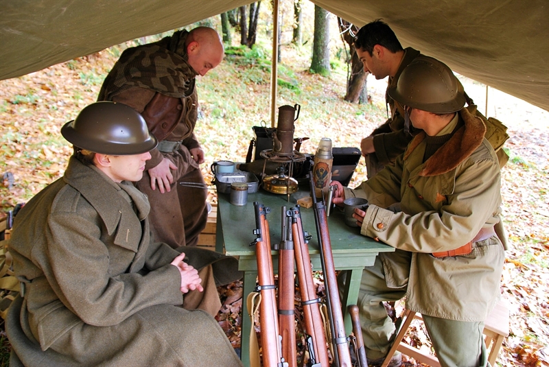 Escenografía de Sancho de Beurko en la que se recrea un supuesto encuentro entre británicos y franceses en el invierno del 39-40 en el que se ríen, confraternizan, se refugian bajo la intensa lluvia mientras comparten un café, se intercambian revistas y juegan al Tiddlywinks, uno de los juegos de mesa más populares de la época que daría lugar al célebre “Spitfire target”. El esfuerzo que han hecho nuestros recreadores ha sido muy grande, ya que se componen por primera vez personajes de los Cuerpos Francos y de un soldado de infantería del período 1940, en este caso perteneciente al 18e Régiment d´Infanterie con base en Pau, formado por vascos y bearneses, que destacaría en los combates en torno a Attigny, en Ardenas, donde fallecieron 130 soldados del departamento de Bajos Pirineos (actual Pirineos Atlánticos). Agradecer a los recreadores por la composición de los personajes, incluyendo dos del British Expeditionary Force (BEF).