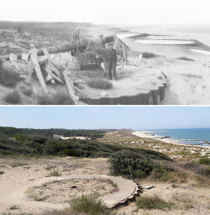 Los vestigios interesantes no se encuentran únicamente dentro de los bunkers, sino que paseando por las dunas todavía pueden verse los viejos emplazamientos en barbeta o descubiertos de la batería francesa original. Pero sin duda son otros los emplazamientos que más nos llaman la atención: los que los propios alemanes realizaron en 1944 por delante de las casamatas M270 para sacar las piezas de sus emplazamientos cubiertos y poder orientarlas tierra adentro una vez se hubo cerrado la bolsa en torno a la Pointe de Grave. En ese momento, el enemigo ya no sólo vendría por el mar sino también por el interior y las piezas de largo alcance eran necesarias para batir objetivos en tierra, algo que se repitió continuamente a partir del día 14 de abril de 1945 cuando las fuerzas francesas rompieron el frente y avanzaron hacia Soulac. Así lo delata esta comparativa en la que puede verse el emplazamiento de uno de estos cañones en 1945 (Foto Armand Gilbert), justo después de la batalla, y en la actualidad.
